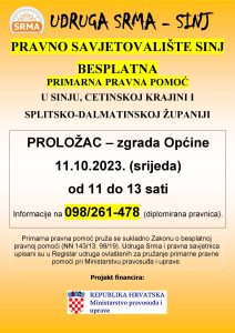 11.10.2023., srijeda, u 11h, u prostorijama Općine Proložac održati će Besplatna primarna pravna pomoć, u organizaciji Pravnog savjetovališta Sinj a u sklopu projekta Ministarstva pravosuđa i uprave.